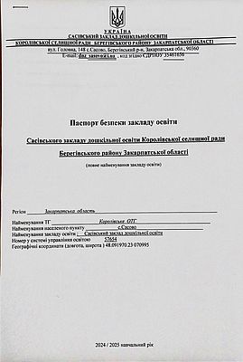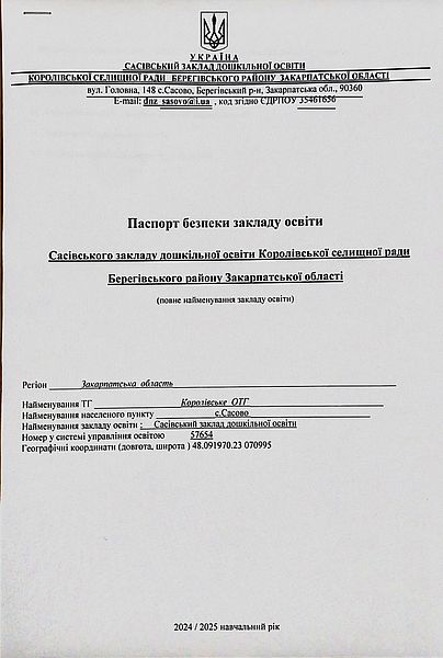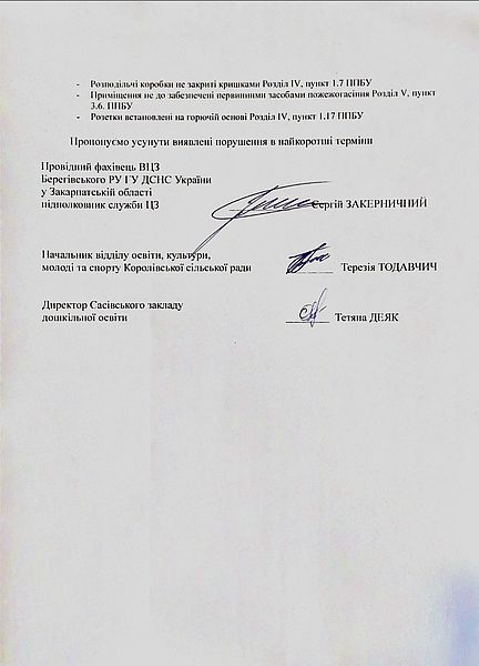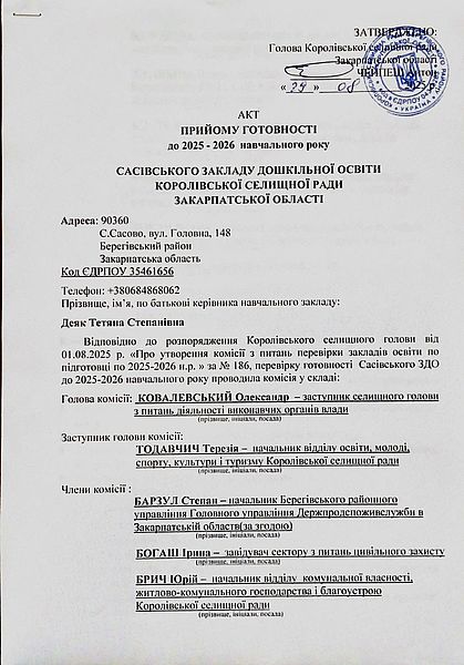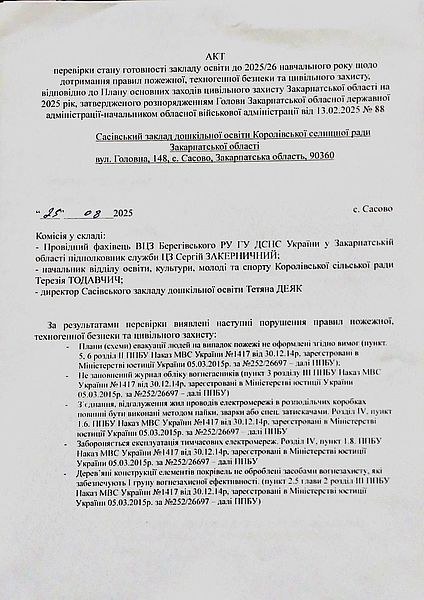Акт перевірки стану готовності закладу дошкільної освіти до 2025-2026 навчального року щодо дотримання вимог пожежної, техногенної безпеки та цивільного захисту