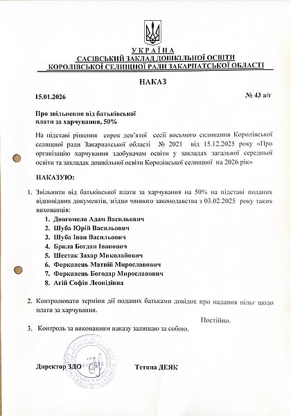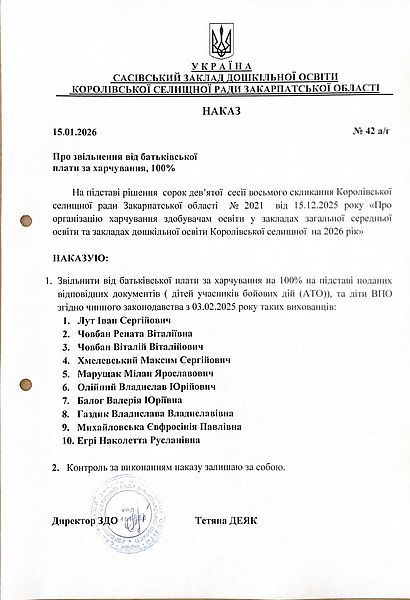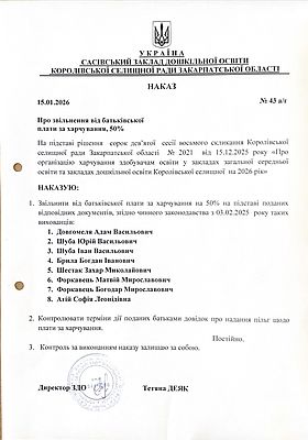 На підставі рішення сорок дев’ятої сесії восьмого скликання Королівської селищної ради Закарпатської області № 2021 від 15.12.2025 року «Про організацію харчування здобувачам освіти у закладах загальної середньої освіти та закладах дошкільної освіти Королівської селищної на 2026 рік»